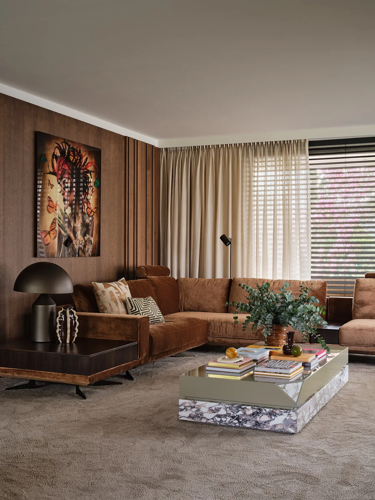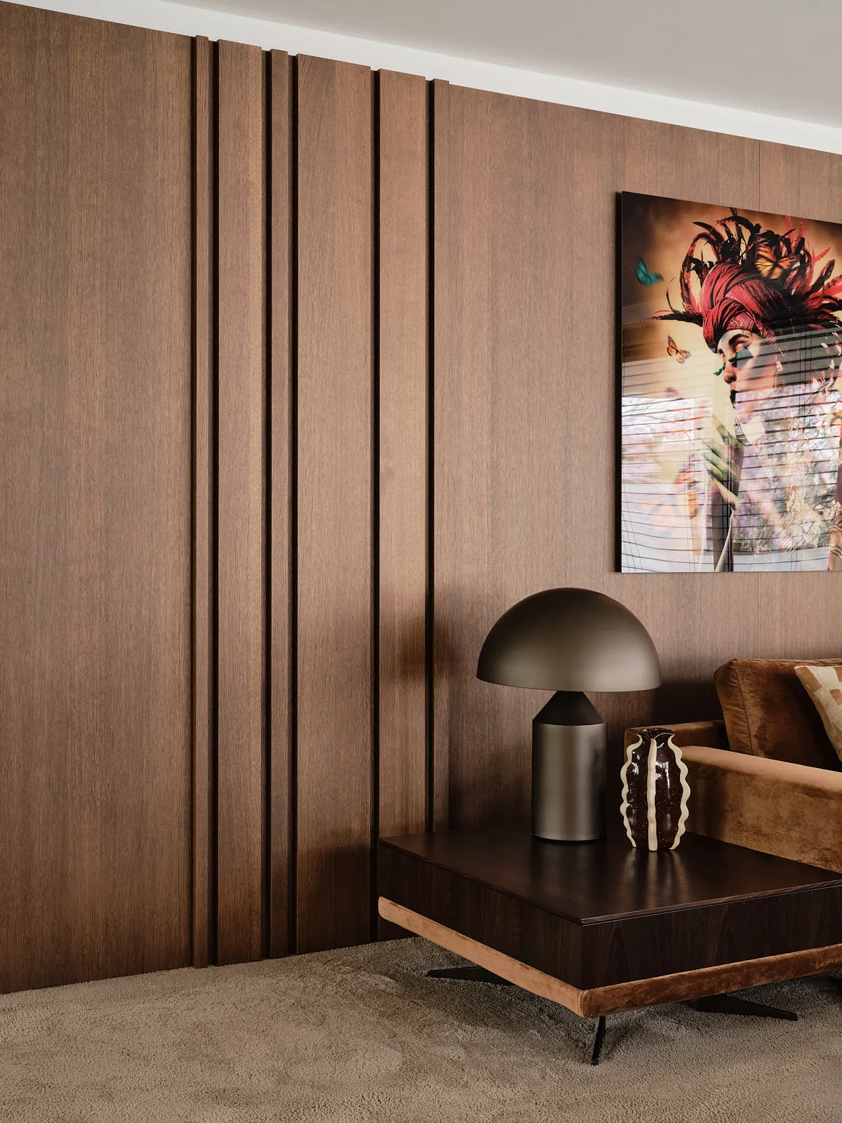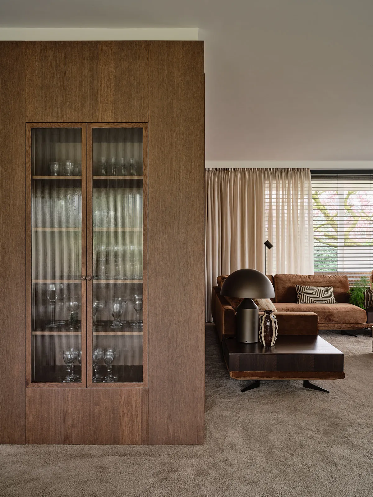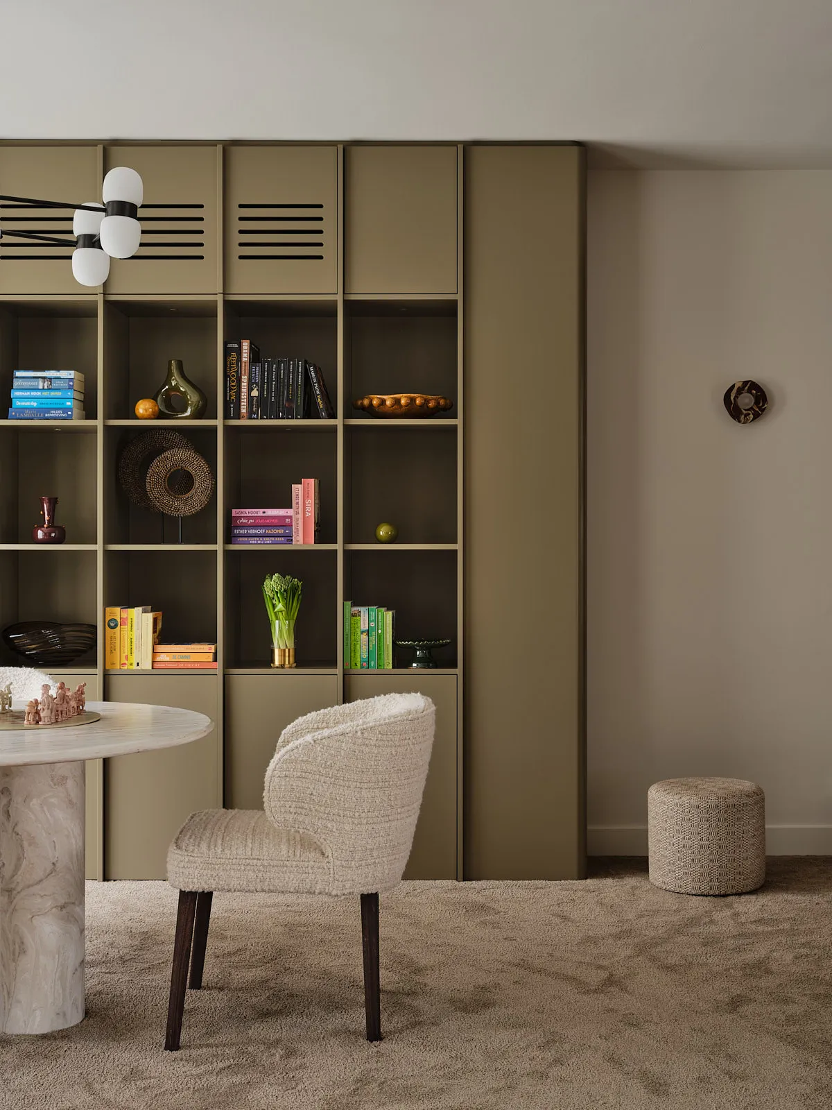 Een relaxte jaren 60-bungalow, omringd door een groene oase waar je echt vrij woont. Binnen draait alles om sfeer: een walnoot houten wand en maatwerkkasten geven warmte en karakter, terwijl groentinten en speelse kleuren en prints het geheel fris en levendig maken. Het voelt knus, een tikje retro en tegelijk helemaal eigen — zo’n plek waar binnen en buiten moeiteloos in elkaar overlopen.