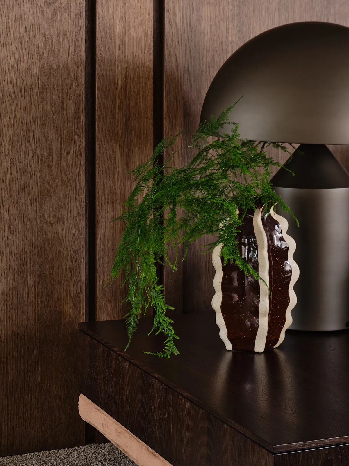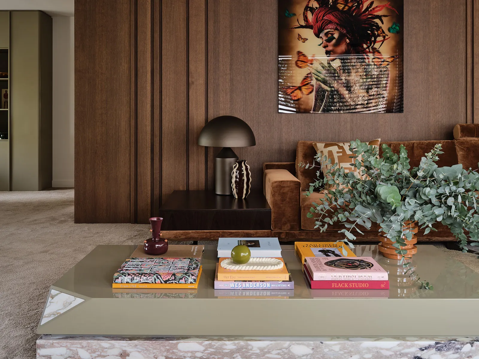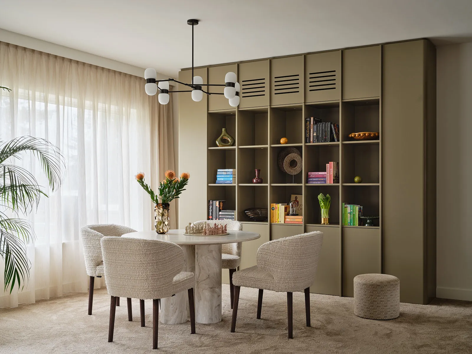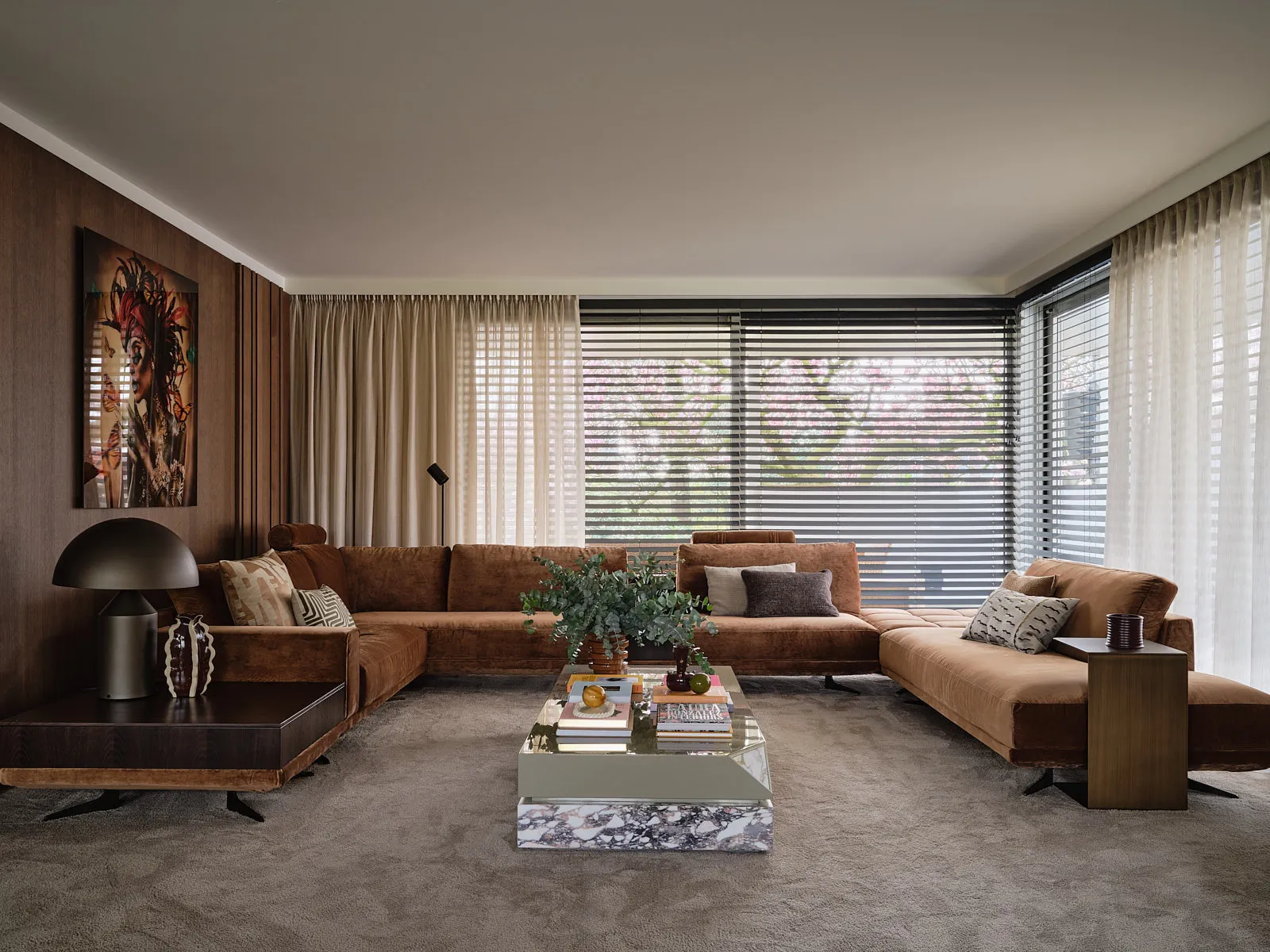 Een relaxte jaren 60-bungalow, omringd door een groene oase waar je echt vrij woont. Binnen draait alles om sfeer: een walnoot houten wand en maatwerkkasten geven warmte en karakter, terwijl groentinten en speelse kleuren en prints het geheel fris en levendig maken. Het voelt knus, een tikje retro en tegelijk helemaal eigen — zo’n plek waar binnen en buiten moeiteloos in elkaar overlopen.
