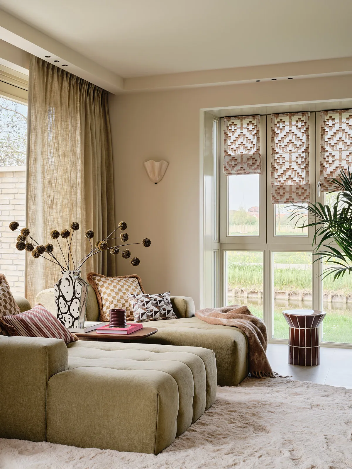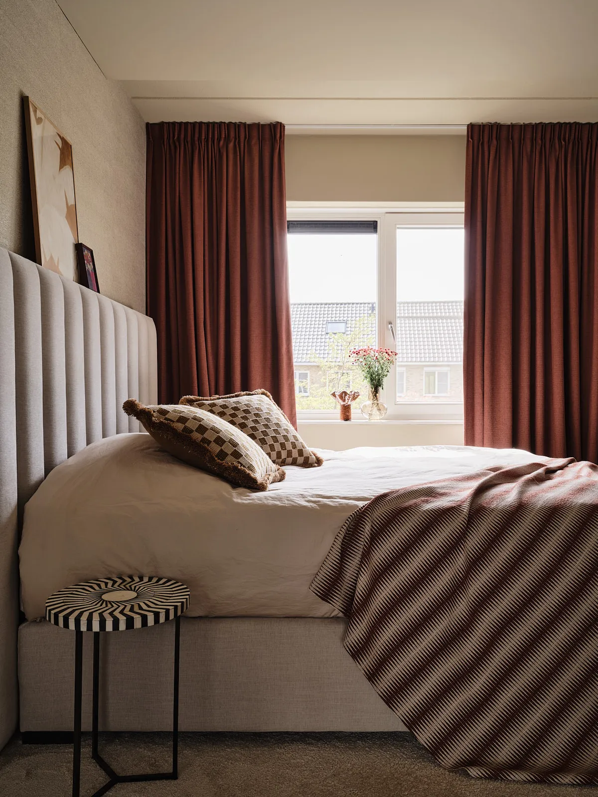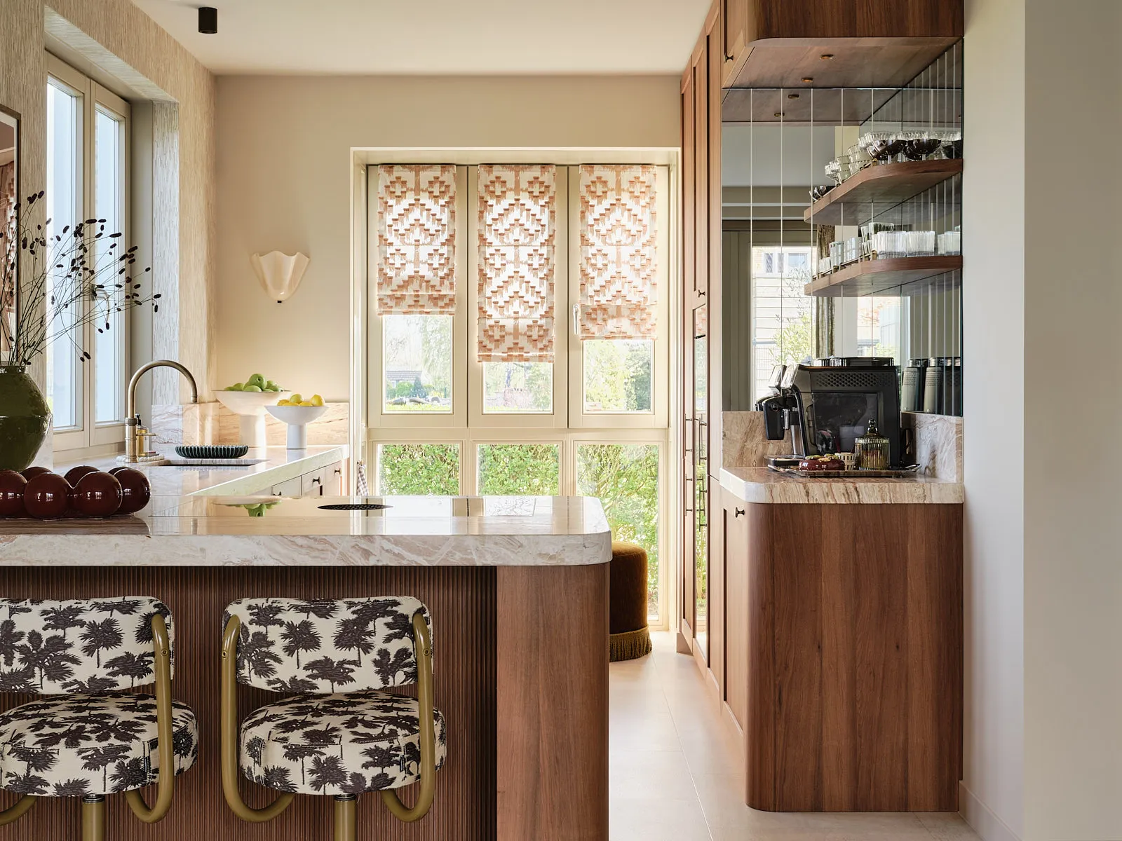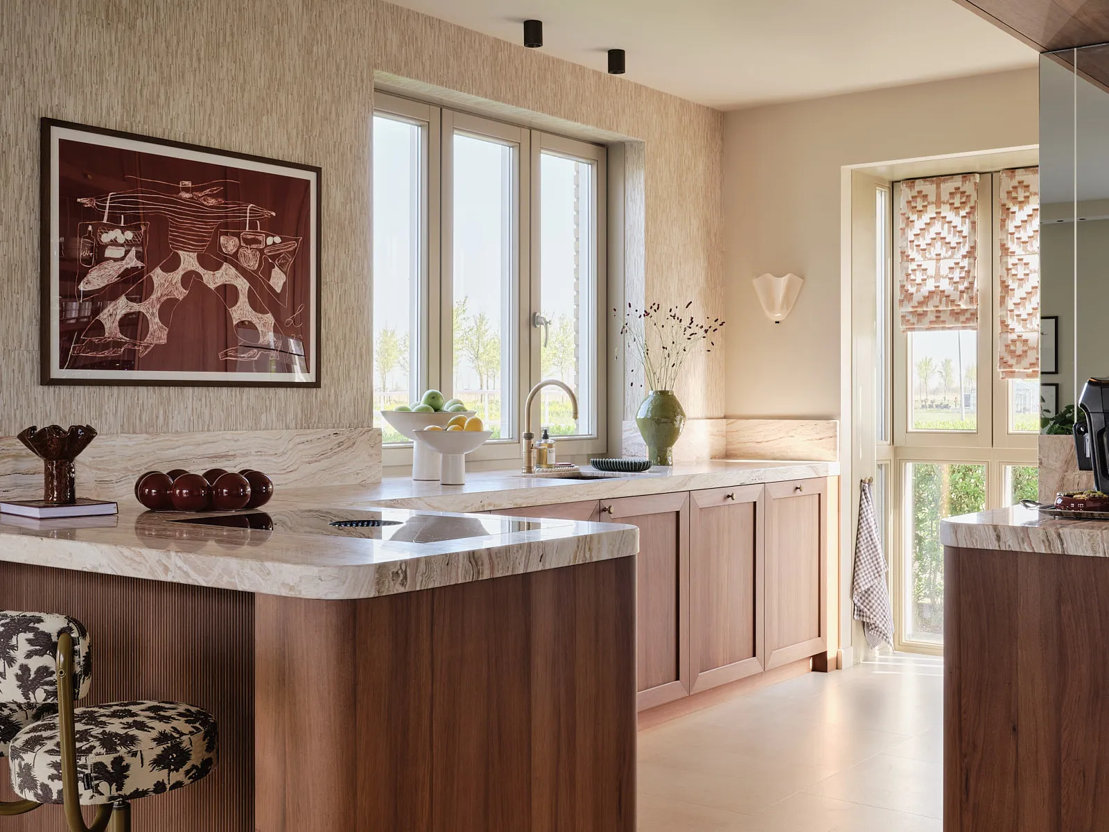 Een eengezinswoning waarin door een slimme herindeling en routing duidelijk meer ruimte is ontstaan. De walnoothouten keuken met kleurrijk marmeren blad vormt een stijlvolle en functionele blikvanger. In het interieur komt een uitgesproken mid-century stijl tot leven, met rijke kleuren en prints zoals burgundy en mosgroen die warmte en karakter toevoegen. De wandkast met toog maakt een krachtig statement en biedt plek aan persoonlijke objecten en herinneringen. De ronde eettafel nodigt uit tot samenzijn, terwijl de zithoek met dubbele chaise longue juist een meer beschutte, private sfeer biedt.