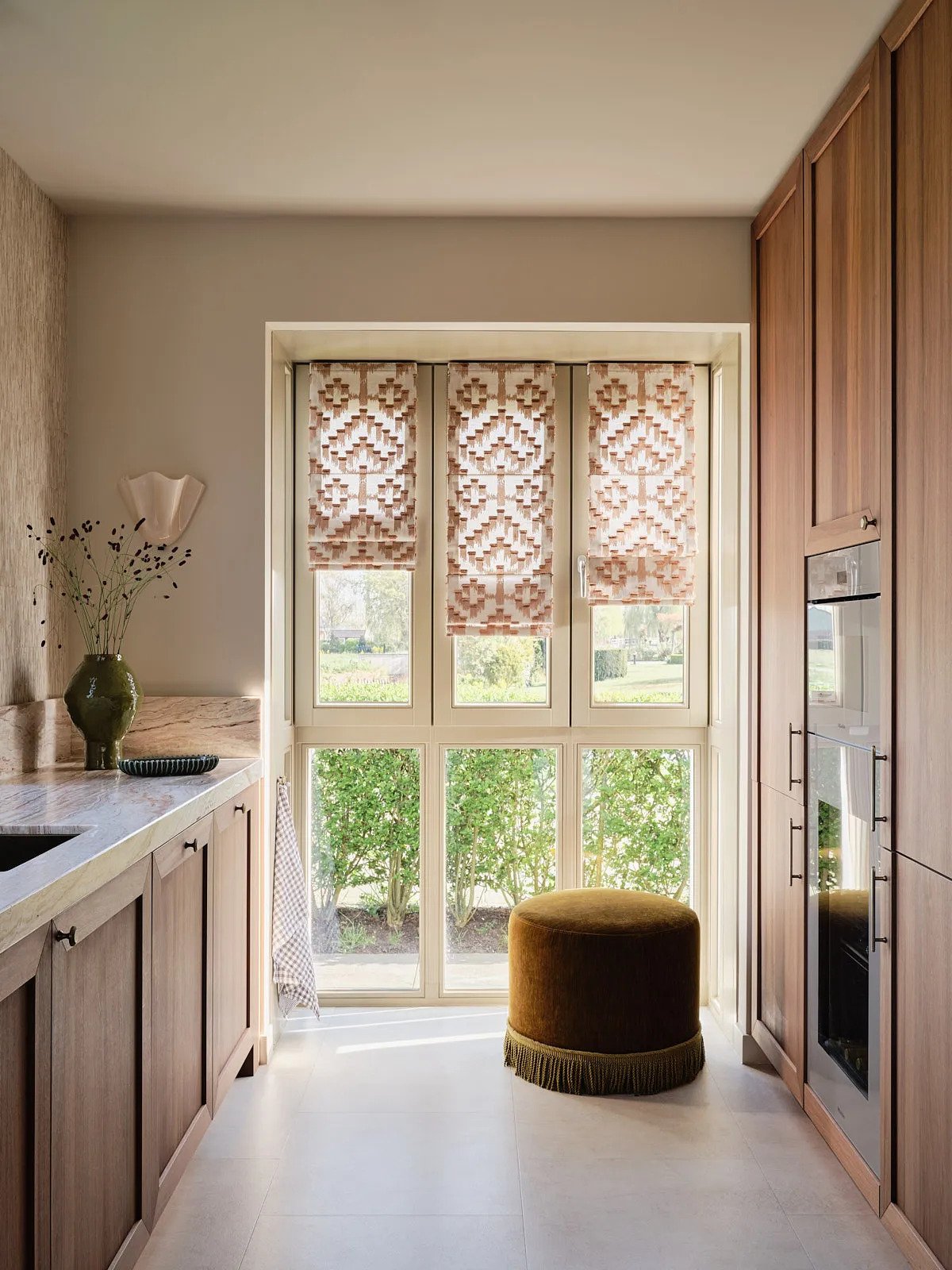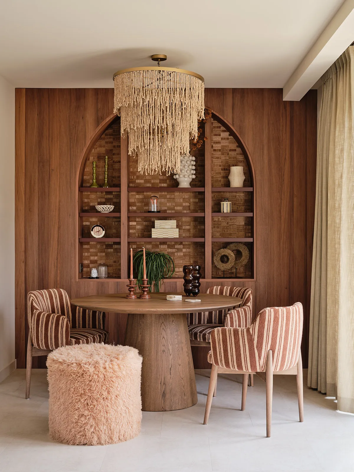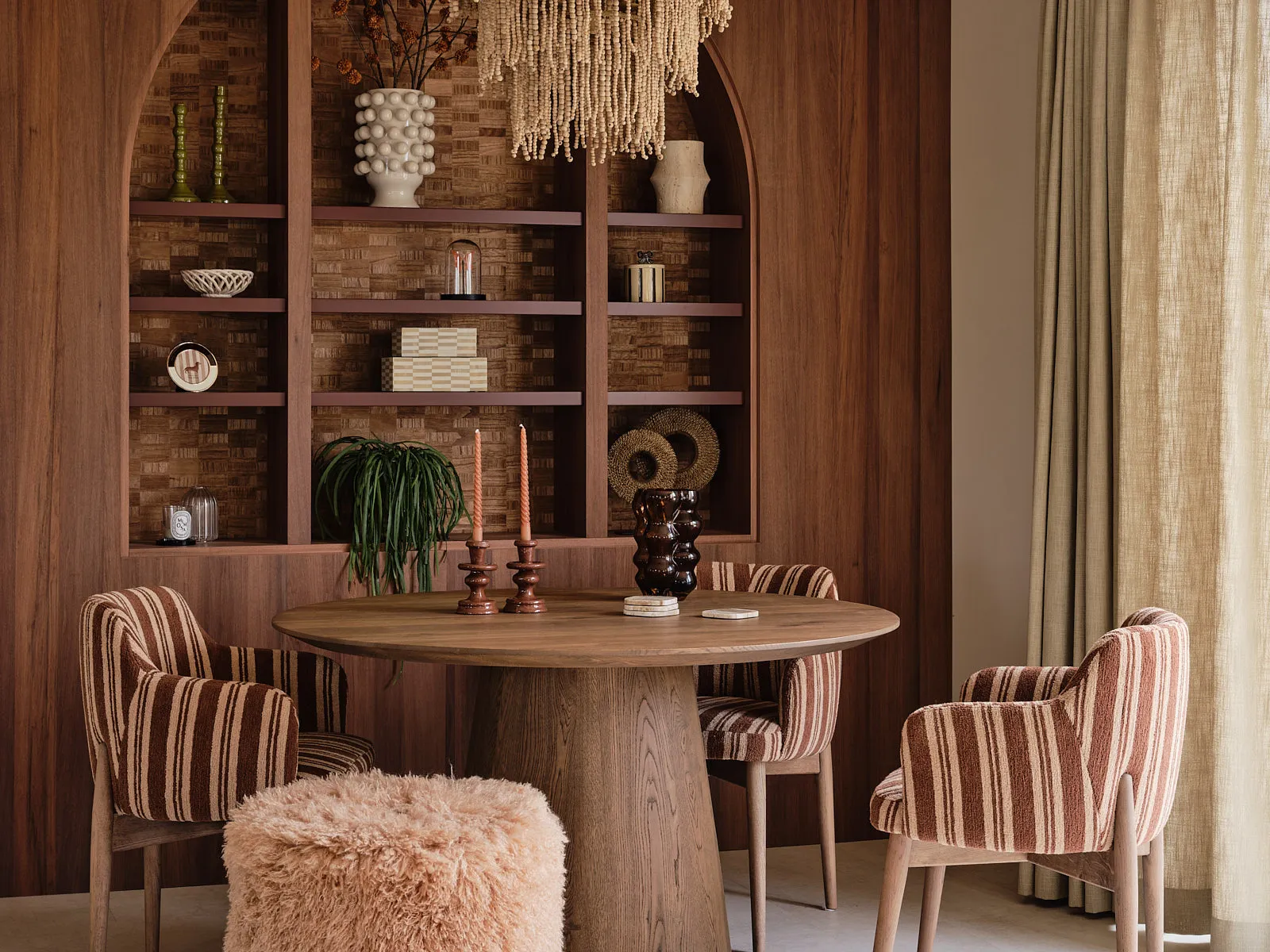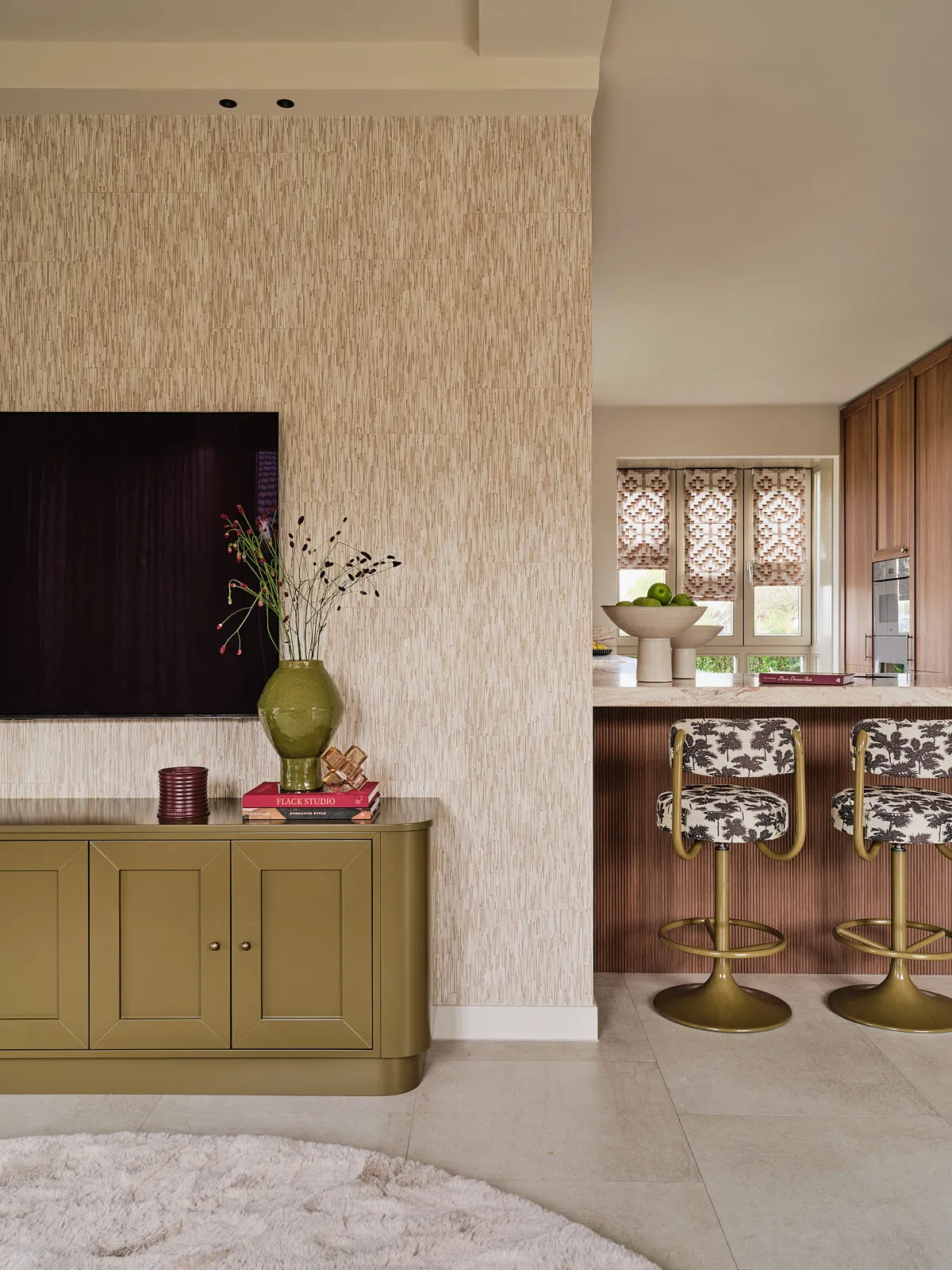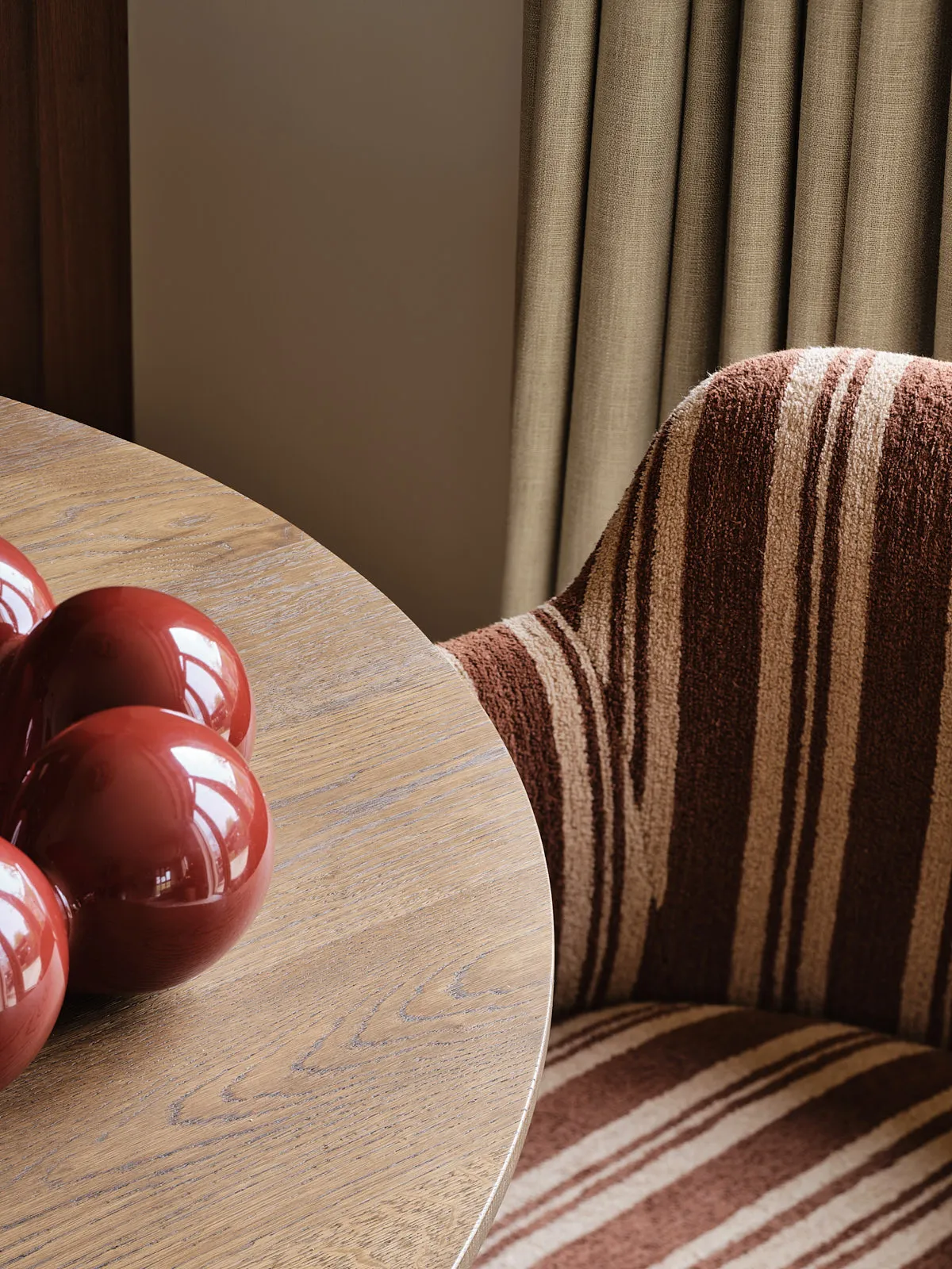 Een eengezinswoning waarin door een slimme herindeling en routing duidelijk meer ruimte is ontstaan. De walnoothouten keuken met kleurrijk marmeren blad vormt een stijlvolle en functionele blikvanger. In het interieur komt een uitgesproken mid-century stijl tot leven, met rijke kleuren en prints zoals burgundy en mosgroen die warmte en karakter toevoegen. De wandkast met toog maakt een krachtig statement en biedt plek aan persoonlijke objecten en herinneringen. De ronde eettafel nodigt uit tot samenzijn, terwijl de zithoek met dubbele chaise longue juist een meer beschutte, private sfeer biedt.