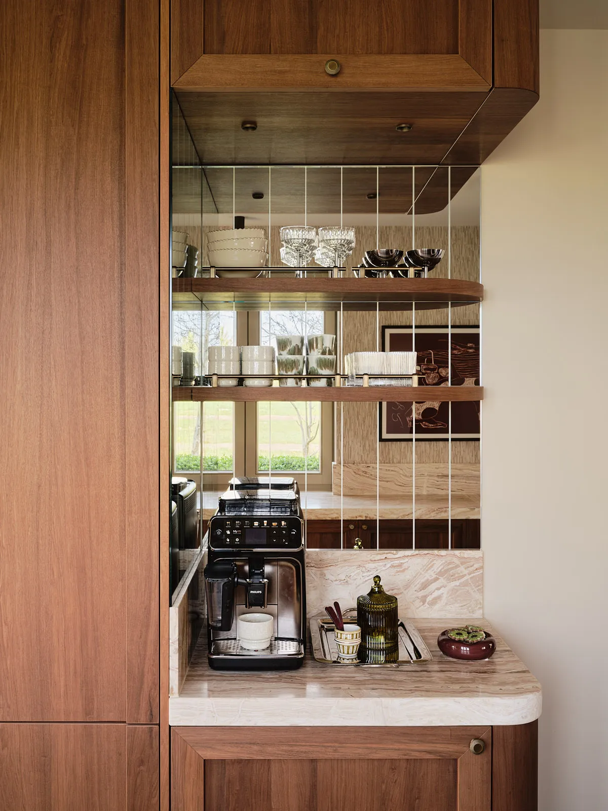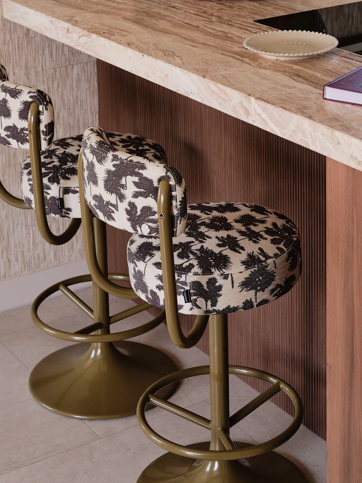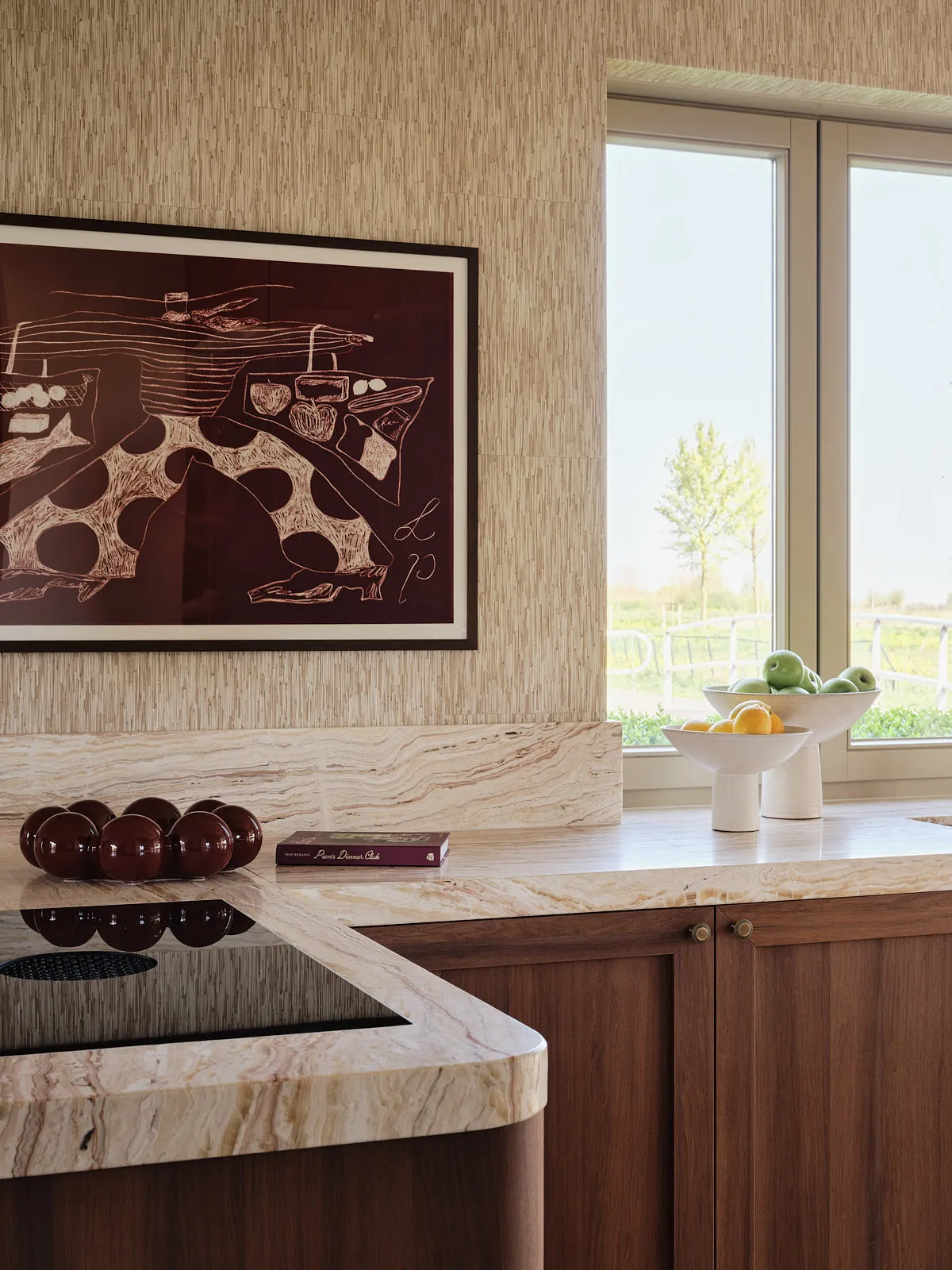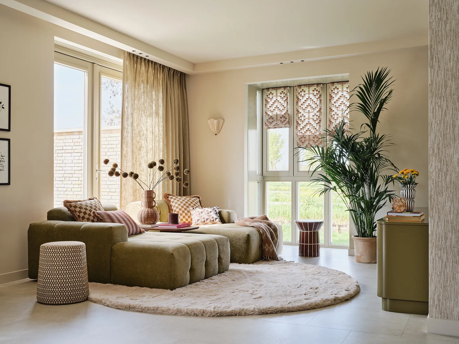 Een eengezinswoning waarin door een slimme herindeling en routing duidelijk meer ruimte is ontstaan. De walnoothouten keuken met kleurrijk marmeren blad vormt een stijlvolle en functionele blikvanger. In het interieur komt een uitgesproken mid-century stijl tot leven, met rijke kleuren en prints zoals burgundy en mosgroen die warmte en karakter toevoegen. De wandkast met toog maakt een krachtig statement en biedt plek aan persoonlijke objecten en herinneringen. De ronde eettafel nodigt uit tot samenzijn, terwijl de zithoek met dubbele chaise longue juist een meer beschutte, private sfeer biedt.