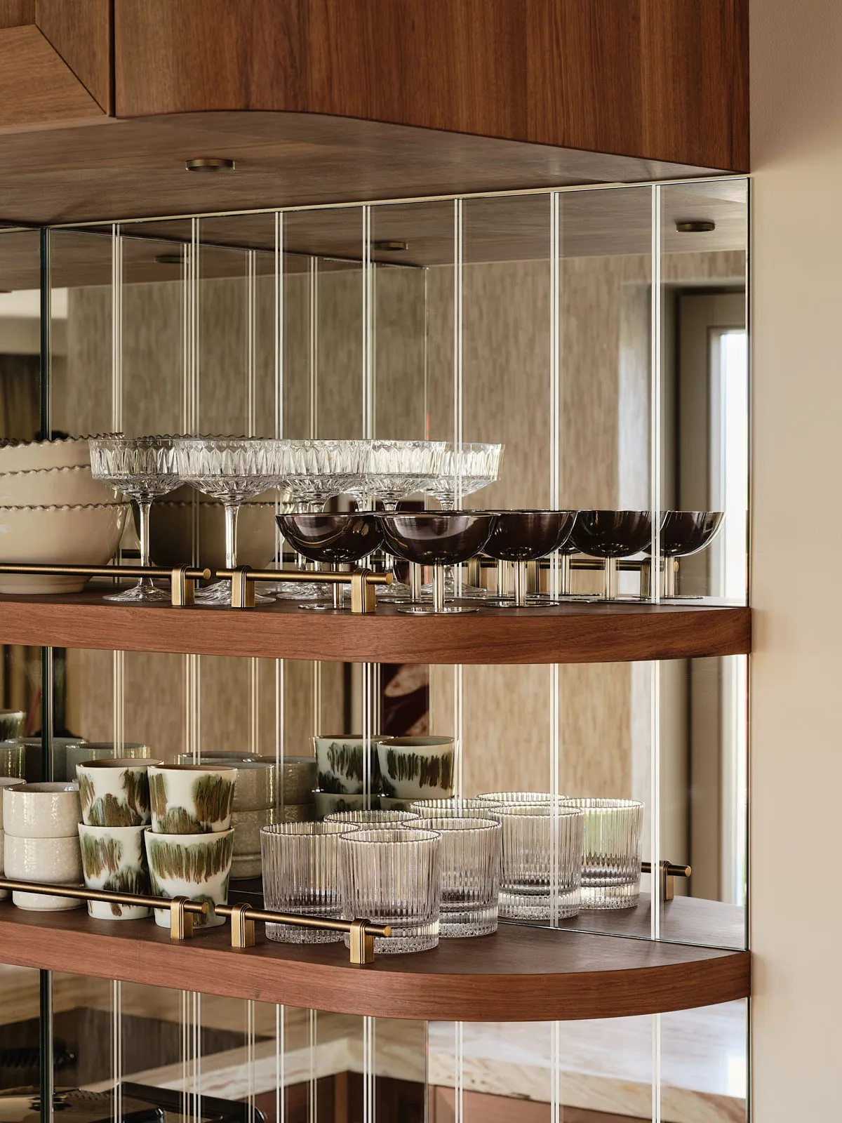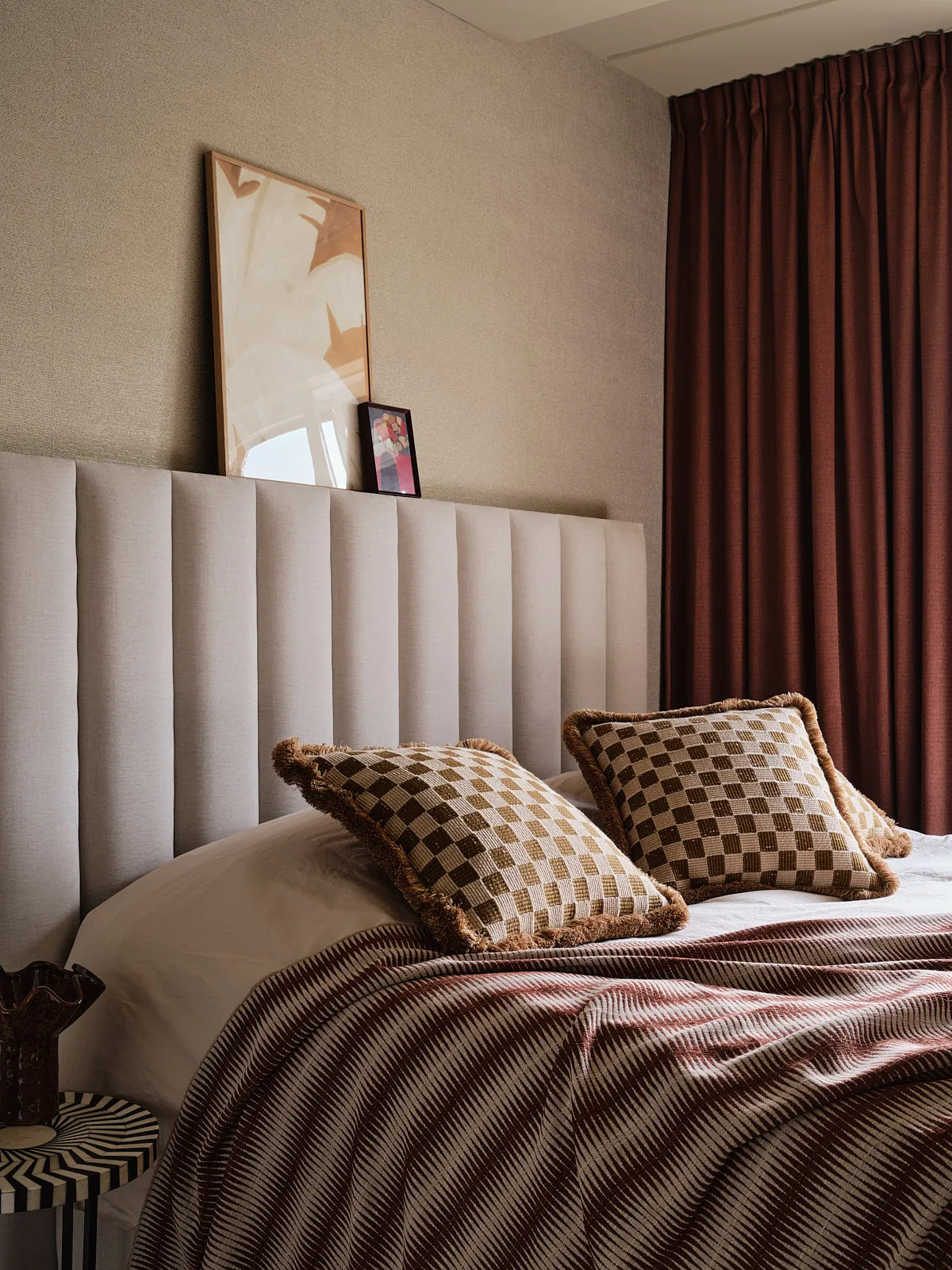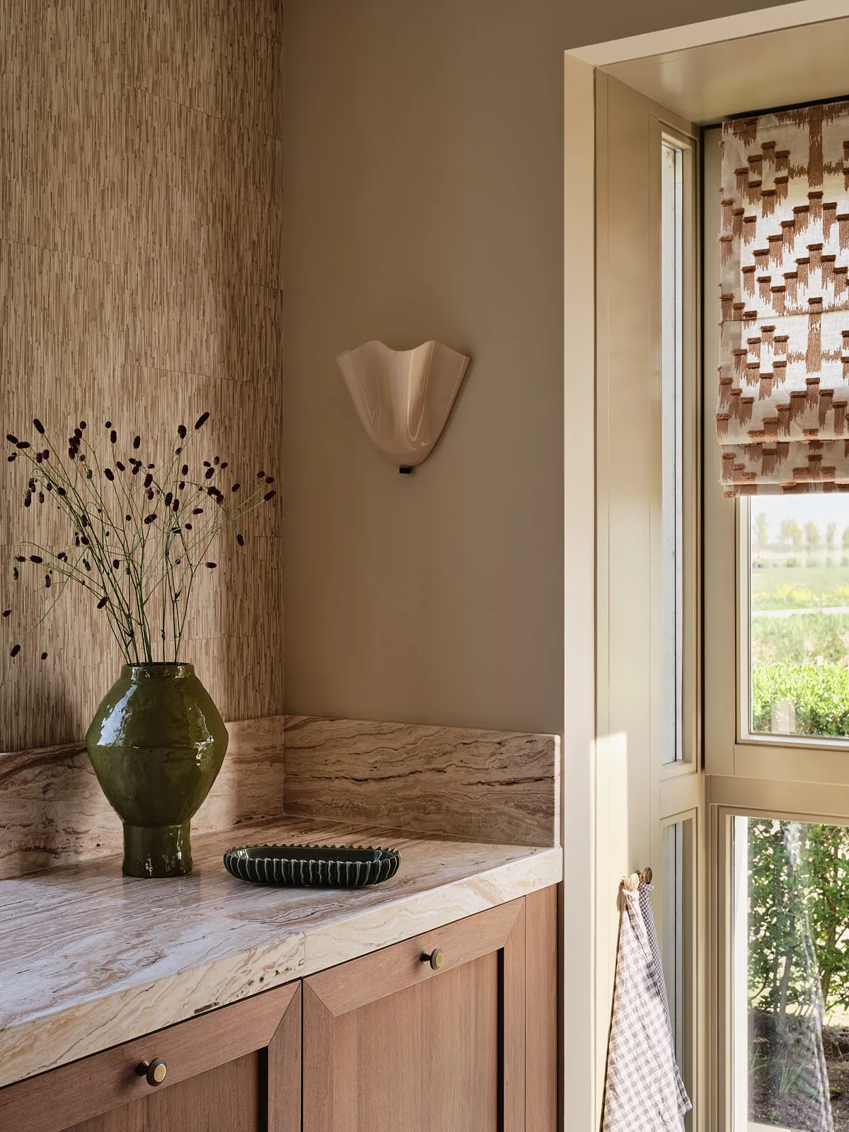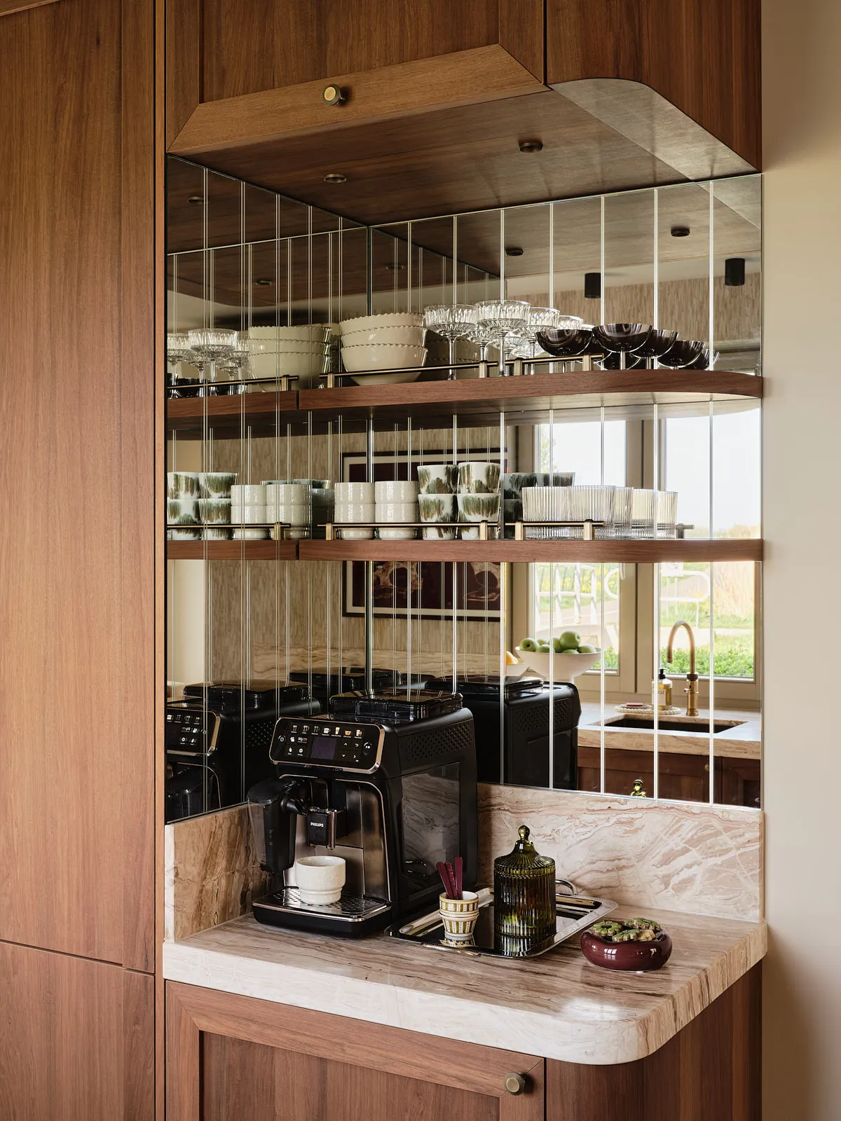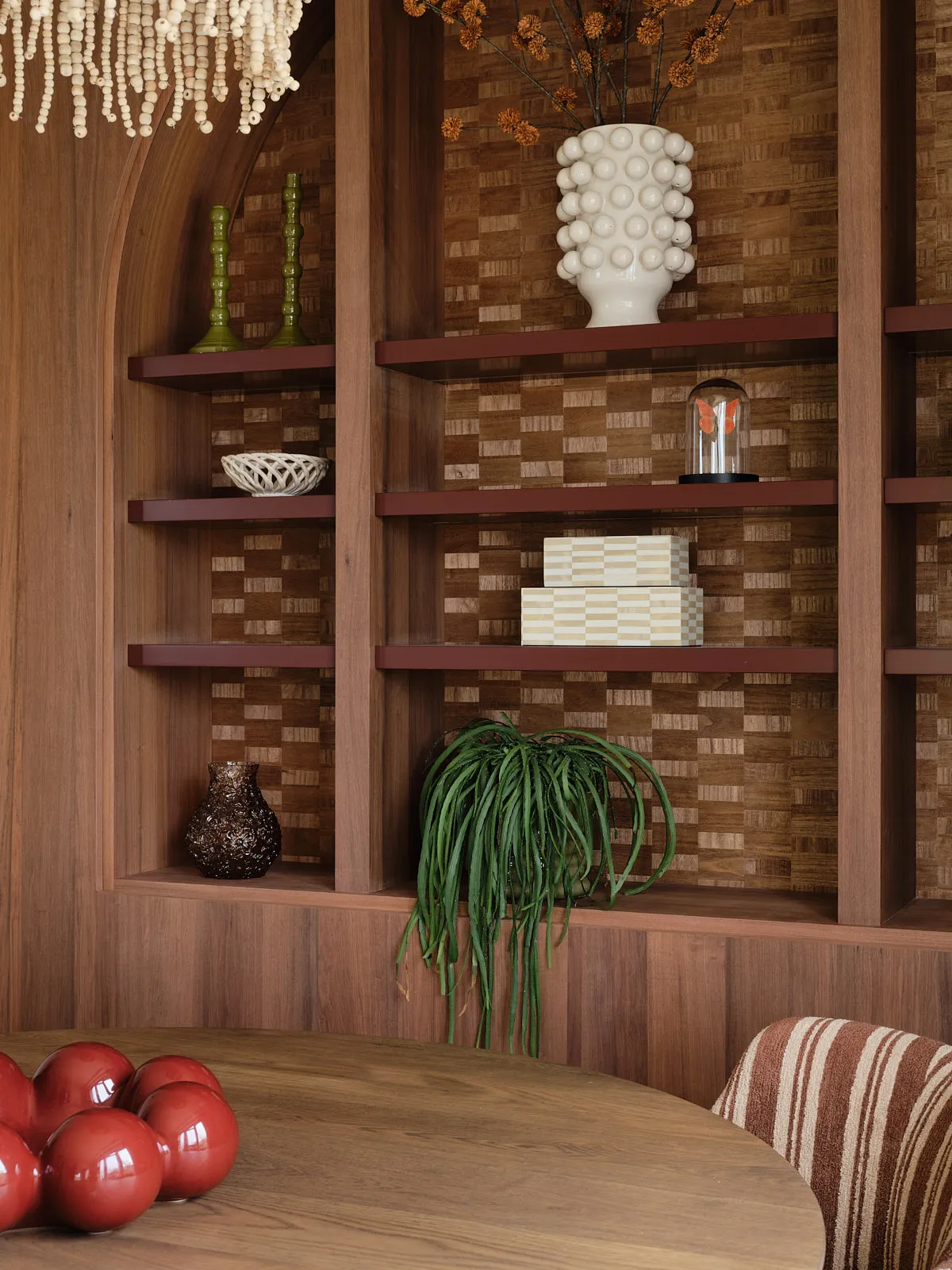 Een eengezinswoning waarin door een slimme herindeling en routing duidelijk meer ruimte is ontstaan. De walnoothouten keuken met kleurrijk marmeren blad vormt een stijlvolle en functionele blikvanger. In het interieur komt een uitgesproken mid-century stijl tot leven, met rijke kleuren en prints zoals burgundy en mosgroen die warmte en karakter toevoegen. De wandkast met toog maakt een krachtig statement en biedt plek aan persoonlijke objecten en herinneringen. De ronde eettafel nodigt uit tot samenzijn, terwijl de zithoek met dubbele chaise longue juist een meer beschutte, private sfeer biedt.